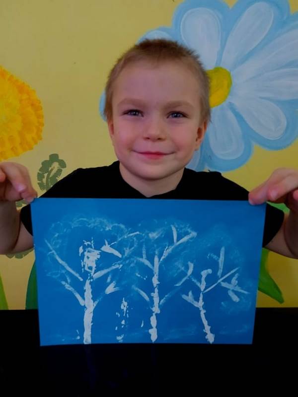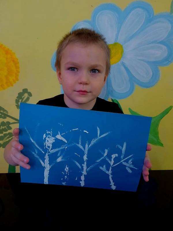 Краской гуашь белого цвета на картоне прорисуем деревья. Их расположение и количество зависит от вашей фантазии.