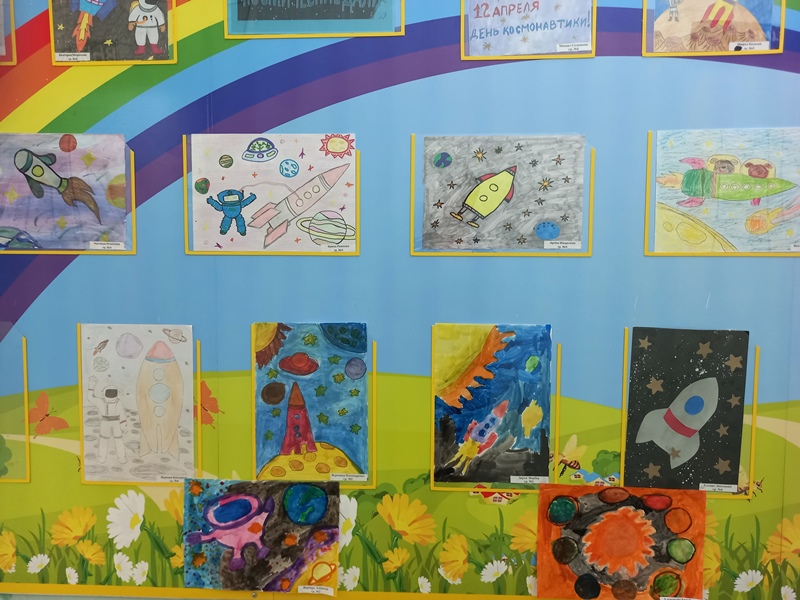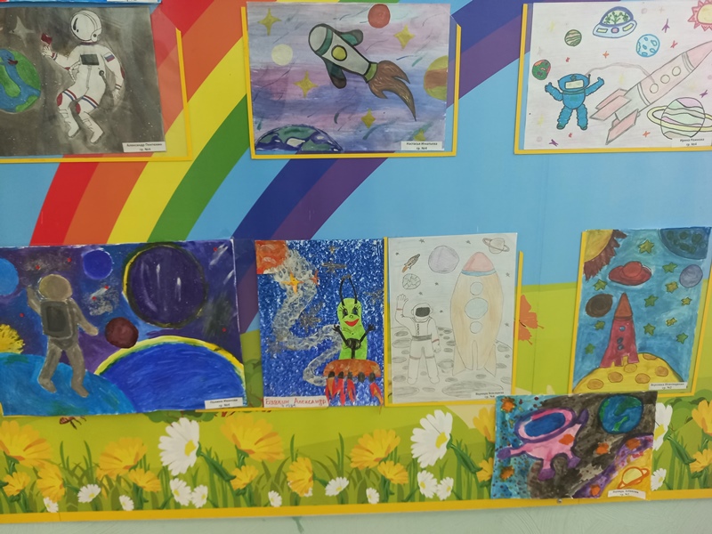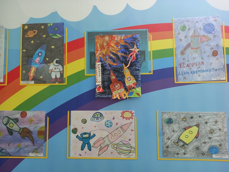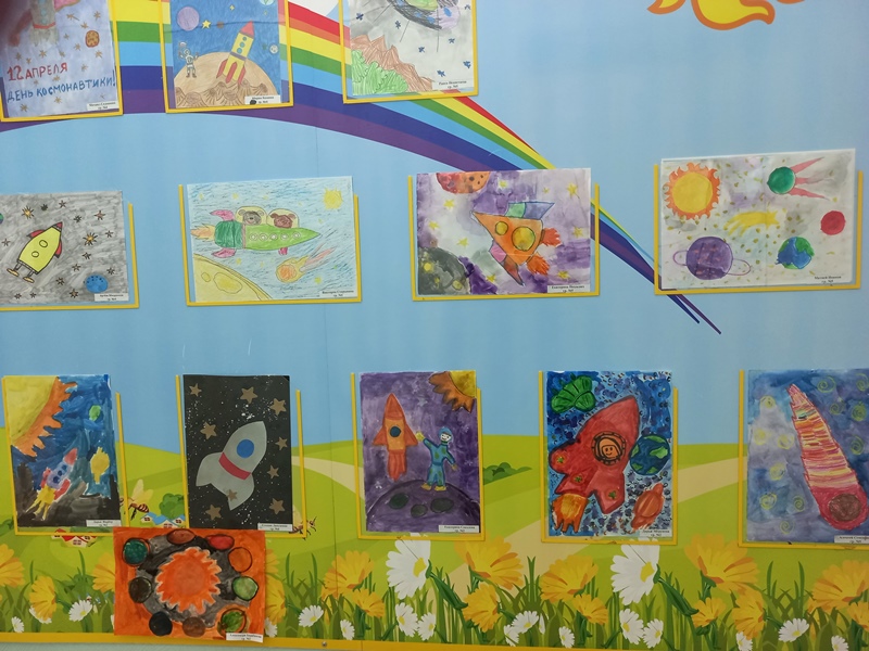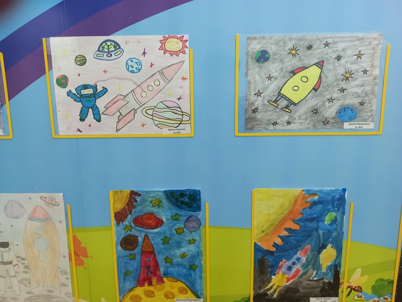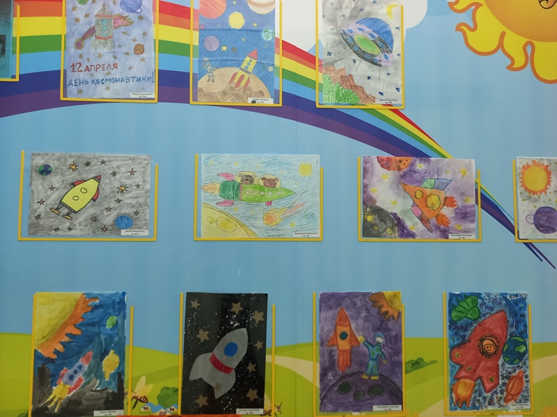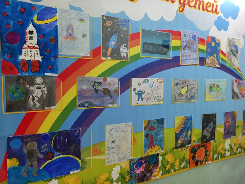 В преддверии праздника была организована выставка творческих работ «Космические дали», на которой представлены рисунки космических кораблей, звёзд, планет.