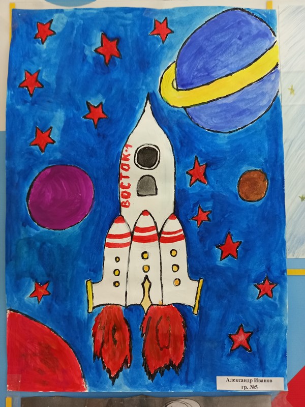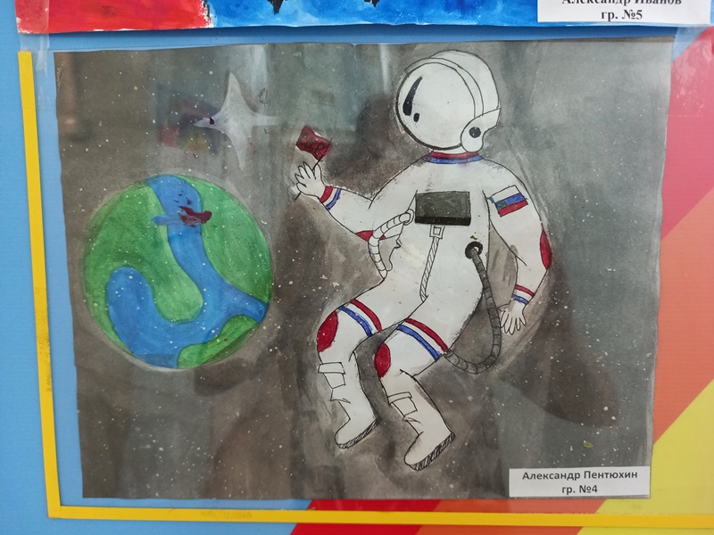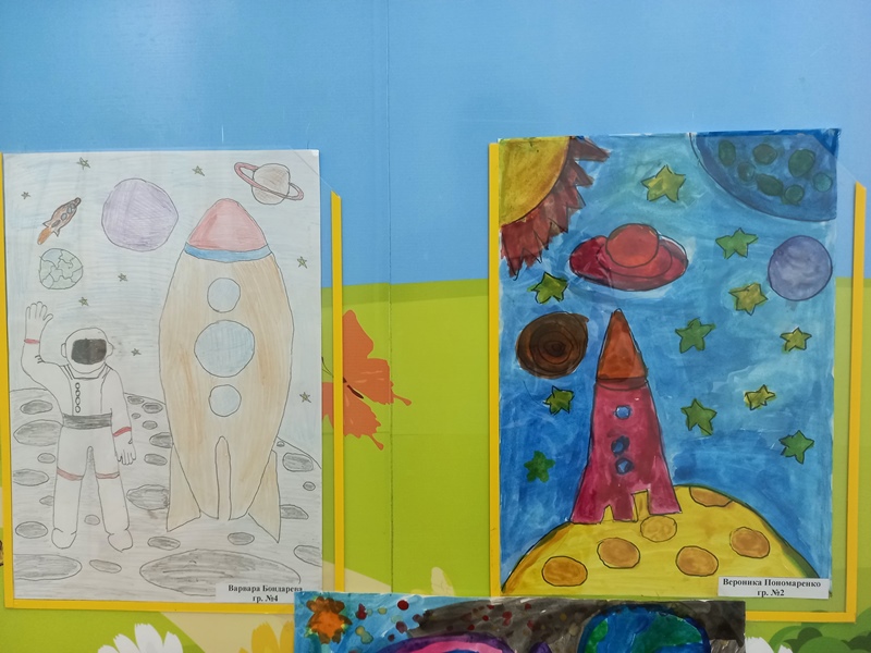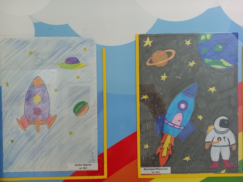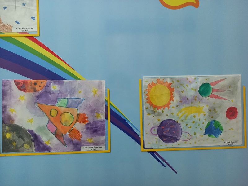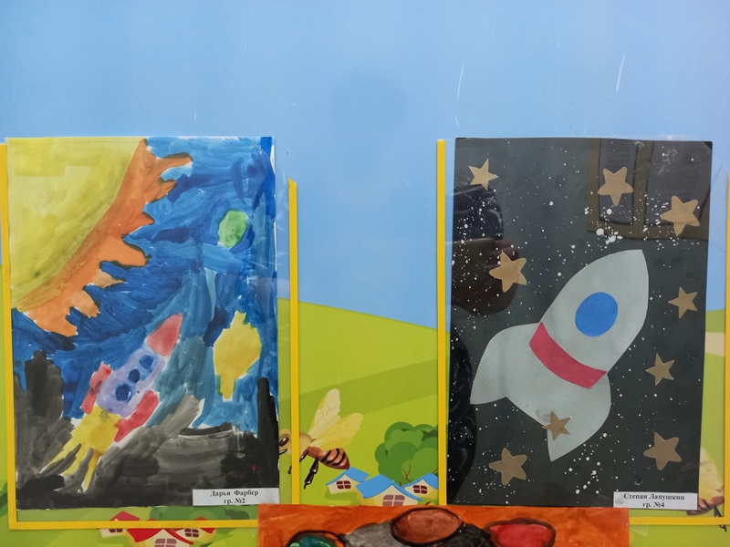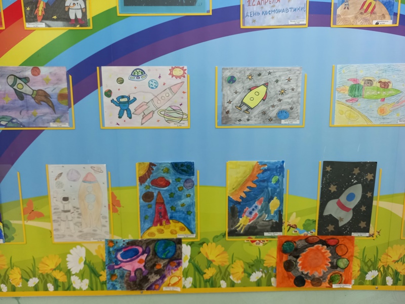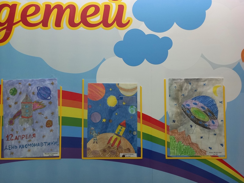 В преддверии праздника была организована выставка творческих работ «Космические дали», на которой представлены рисунки космических кораблей, звёзд, планет.