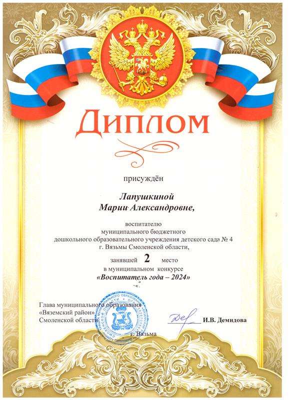 От всей души коллектив МБДОУ детского сада №4 г. Вязьмы Смоленской области поздравляет Лапушкину Марию Александровну с заслуженной наградой! Желает ей дальнейших побед, творческих успехов, неиссякаемой энергии, вдохновения в работе, не останавливаться на достигнутом результате, всегда идти вперед!!! Пусть этот конкурс даст толчок к дальнейшему вашему профессиональному росту!